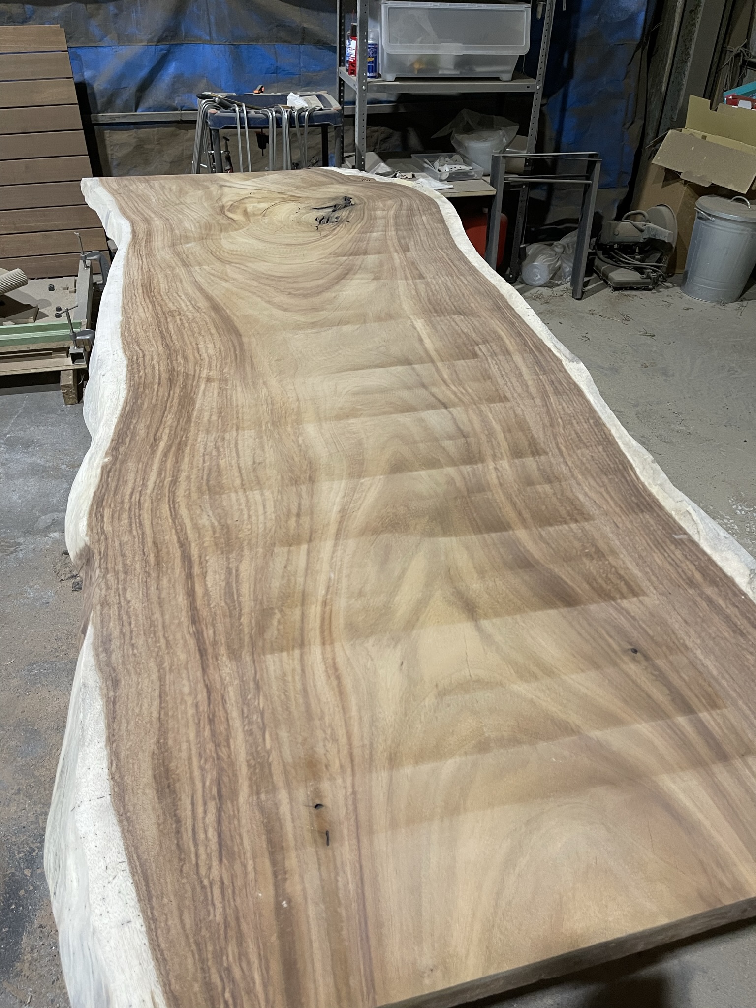 未分類弊社工場にてモンキーポッドのテーブル天板の最終仕上げを行っています。材料を天然乾燥した後、人工乾燥機に投入し、適切な含水率まで水分を抜きます。その後、高周波プレスをかけ